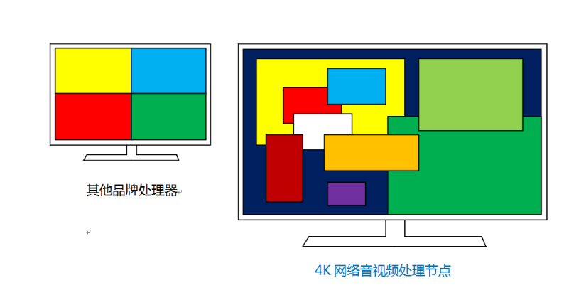 单个输出节点可同时解码4路4K,16路1080P,32路720P或64路D1,在4K的现实区域内,这些信号可实现任意拼接、开窗、漫游、叠加,没有图层的限制。