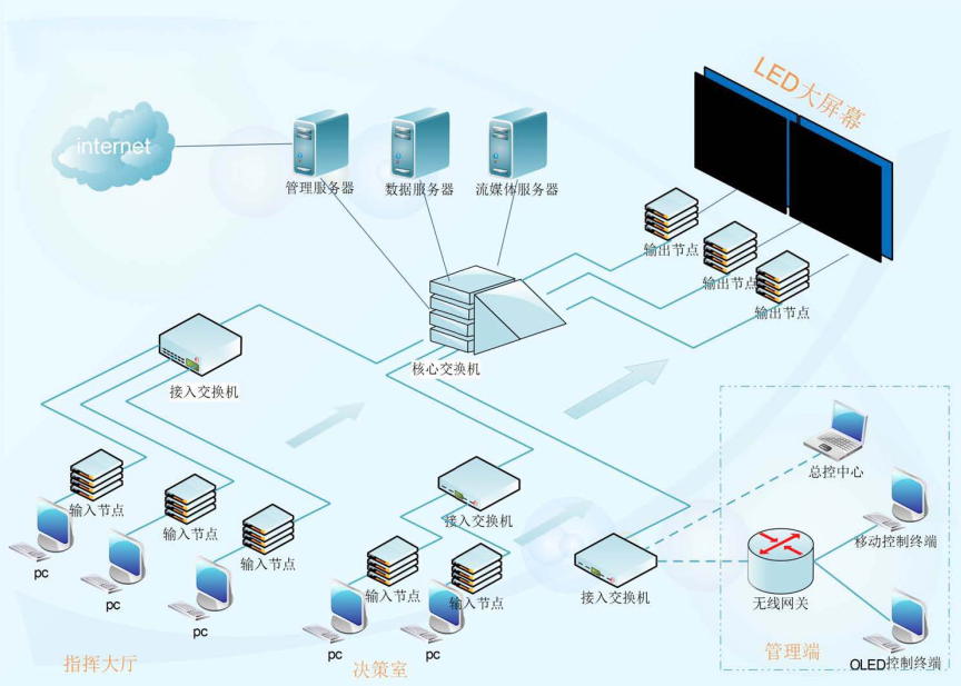 2、视频传输IP化:有的视频信号全部转换为IP信号,进入到分布式系统的局域网内,实现视频传输、交互、切换。